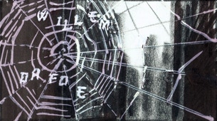 Custom letterforms wiggle like flies helplessly caught in the urban web between skyscrapers . Typography design, Prologue Films.